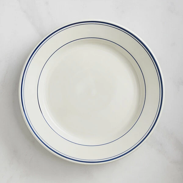 Be the first to review “Acopa 10 1/2″ Ivory (American White) Stoneware Wide Rim Plate With Blue Bands – 12/Case” Cancel reply