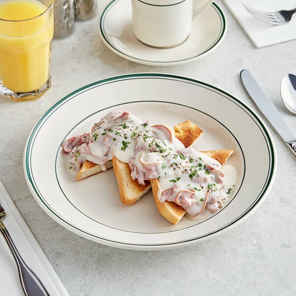 Be the first to review “Acopa 10 1/2″ Ivory (American White) Stoneware Wide Rim Plate With Green Bands – 12/Case” Cancel reply