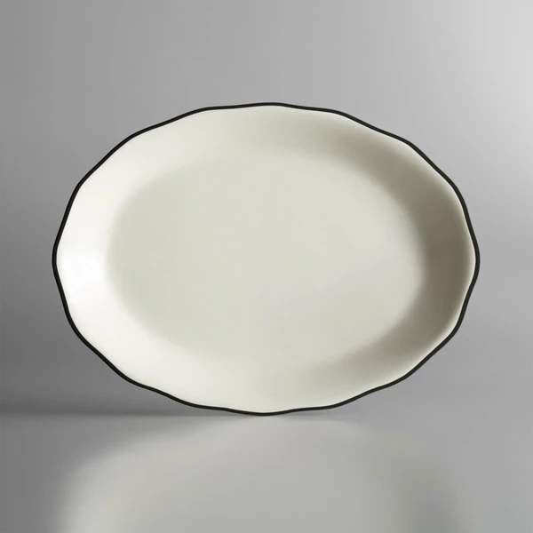 Be the first to review “Acopa 11 5/8″ X 8 1/2″ Ivory (American White) Scalloped Edge Stoneware Platter With Black Band – 12/Case” Cancel reply