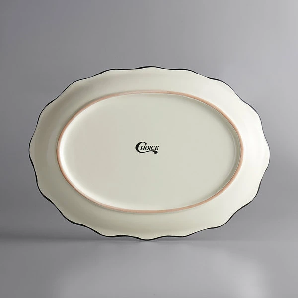 Be the first to review “Acopa 12 5/8″ X 9 1/4″ Ivory (American White) Scalloped Edge Stoneware Platter With Black Band – 12/Case” Cancel reply