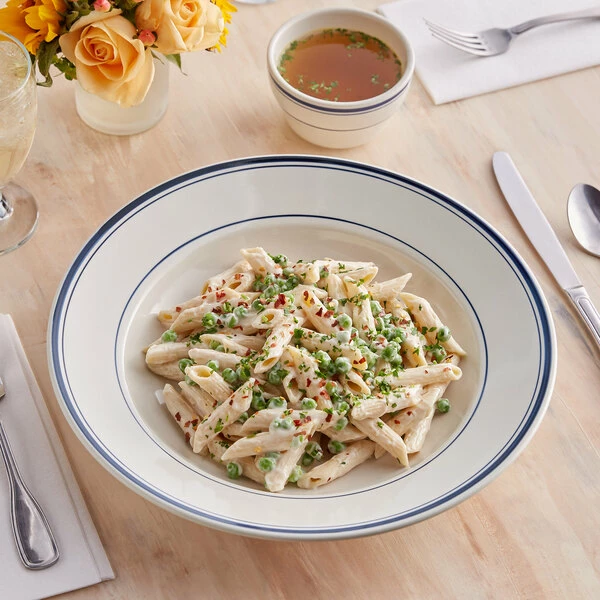 Be the first to review “Acopa 26 Oz. Ivory (American White) Wide Rim Stoneware Pasta Bowl With Blue Bands – 12/Case” Cancel reply
