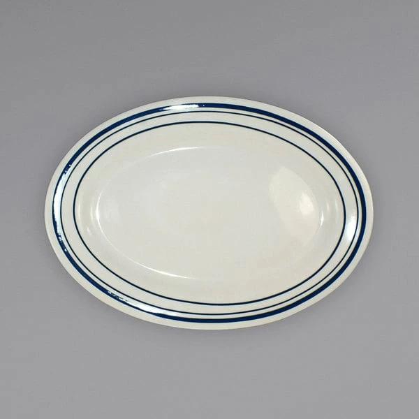 Be the first to review “International Tableware CT-14 Catania 12 1/2″ X 9″ Ivory (American White) Stoneware Platter With Blue Bands – 12/Case” Cancel reply