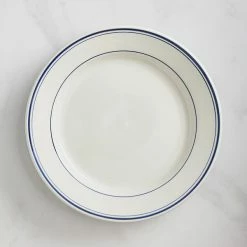 Acopa 10 1/2″ Ivory (American White) Stoneware Wide Rim Plate With Blue Bands – 12/Case