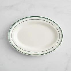 Acopa 11 5/8″ X 8″ Ivory (American White) Wide Rim Stoneware Platter With Green Bands – 12/Case