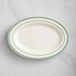 Acopa 11 5/8″ X 8″ Ivory (American White) Wide Rim Stoneware Platter With Green Bands – 12/Case